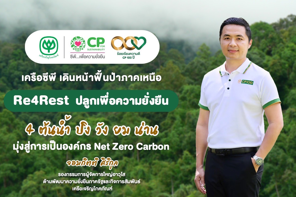 นายจอมกิตติ ศิริกุล รองกรรมการผู้จัดการใหญ่อาวุโส ด้านพัฒนาความยั่งยืนภาครัฐและกิจการสัมพันธ์ เครือเจริญโภคภัณฑ์ เปิดเผยว่า จากนโยบายเครือเจริญโภคภัณฑ์ ได้กำหนดเป้าหมายด้านความยั่งยืนสู่การเป็นองค์กรที่ปล่อยก๊าซเรือนกระจกสุทธิเป็นศูนย์ (Net Zero Emission) ในปี ค.ศ. 2050 เพื่อลดปัญหาการเปลี่ยนแปลงสภาพภูมิอากาศ (Climate Change) ซึ่งเป็นสาเหตุทำให้เกิดภาวะโลกร้อนอย่างต่อเนื่อง โดยเฉพาะเรื่องสิ่งแวดล้อม ที่เครือซีพีลงมือทำอย่างจริงจังและต่อเนื่องมาเป็นเวลายาวนาน ผ่านโครงการ “Re4Rest” ปลูกเพื่อความยั่งยืน 4 ต้นน้ำ ภาคเหนือ ปิง วัง ยม น่าน ซึ่งไม่เพียงฟื้นคืนผืนป่า และความหลากหลายทางชีวภาพ เป็นต้นทางของทรัพยากรและแหล่งเก็บกักคาร์บอนไดออกไซด์ แต่ยังดูแลเกษตรกรและพัฒนาชุมชนให้สามารถอยู่ได้ด้วยตัวเองในรูปแบบ Social Enterprise ควบคู่ไปด้วย โดยเครือซีพีได้เข้าไปสนับสนุน จำนวน 5 พื้นที่ ได้แก่ โครงการสบขุ่น โมเดล กาแฟสร้างป่าสร้างรายได้ อ.ท่าวังผา จ.น่าน โครงการสร้างป่าสร้างรายได้ บ้านนาบง อ.บ่อเกลือ จ.น่าน โครงการฟื้นฟูป่าต้นน้ำ บ้านทุ่งใหม่ อ.ปัว จ.น่าน โครงการเกษตรยั่งยืนแม่วากโมเดล อ. แม่แจ่ม จ.เชียงใหม่ และโครงการปุ๋ยอินทรีย์ชีวภาพ บ้านดอนไชยป่าแขม อ.ปง จ.พะเยา