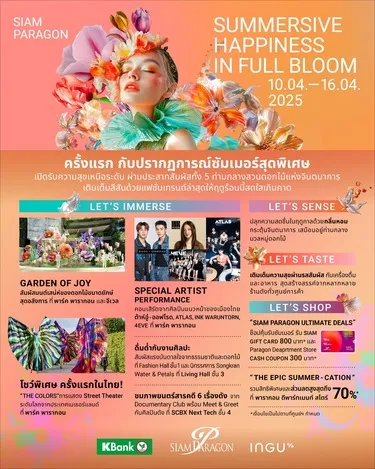 สยามพารากอน ตอกย้ำจุดหมายปลายทางอันดับ 1 ที่อยู่ในใจนักท่องเที่ยวทั้งชาวไทยและต่างชาติ ผนึกกำลังร่วมกับ ธนาคารกสิกรไทย และ INGU มอบประสบการณ์เหนือระดับ สุด Extraordinary ฉลองซัมเมอร์สุดพิเศษท่ามกลางบรรยากาศสวยโลกตะลึง ไปกับงาน “Siam Paragon Summersive : Happiness in Full Bloom” ครั้งแรกของสวนดอกไม้เหนือจินตนาการสุดตระการตา ที่มอบประสบการณ์เหนือระดับในทุกประสาทสัมผัส พร้อมสัมผัสกลิ่นหอมในคอลเลคชั่นสปริง/ซัมเมอร์จากแบรนด์ดัง ห้ามพลาด! กับโชว์พิเศษครั้งแรกในไทย!! THE COLORS การแสดง Street Theater ระดับโลกจากประเทศเนเธอร์แลนด์ และสนุกสนานไปกับคอนเสิร์ตจากศิลปินแถวหน้าของเมืองไทย ตลอดจนผลงานศิลปะที่ได้รับแรงบันดาลใจจากธรรมชาติและดอกไม้ในทุกแง่มุม พร้อมชมภาพยนตร์สารคดีที่จะมอบรอยยิ้มและความสุข เสริมทัพด้วยโปรโมชั่นพิเศษสุดคุ้มค่าระหว่างวันที่ 10-16 เมษายน 2568 ณ สยามพารากอน