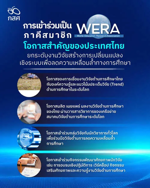 ทั้งนี้ WERA เป็นเครือข่ายของสมาคมการวิจัยด้านการศึกษาระดับชาติ ระดับภูมิภาค และระดับนานาชาติ มีพันธกิจในการส่งเสริมความร่วมมือและยกระดับมาตรฐานการวิจัยทางการศึกษาในระดับนานาชาติ ตลอดจนสนับสนุนการขับเคลื่อนการพัฒนานโยบายและการปฏิบัติที่เกี่ยวกับการวิจัยด้านการศึกษาทั่วโลก โดยปัจจุบันมีภาคีสมาชิกสมาคมการวิจัยด้านการศึกษาระดับชาติจากทั่วโลกมากกว่า 30 สมาคม ซึ่งหลายองค์กรมีประวัติการจัดตั้งและการดำเนินงานสนับสนุนการวิจัยด้านการศึกษามายาวนานมากกว่า 50-100 ปี เช่น American Education Research Association (AERA), European Education Research Association (EERA) หรือ Japanese Education Research Association (JERA) เป็นต้น โดยผู้บริหารของ WERA and AERA ได้เตรียมสนับสนุนการจัดตั้ง THERA ขึ้นในอนาคต และจะส่งผู้แทนสหพันธ์มาร่วมทำงานกับเครือข่ายการวิจัยด้านการศึกษาของประเทศไทยในช่วงวันที่ 7-8 สิงหาคม 2568 นี้ ในการประชุมวิชาการด้านการศึกษาระดับนานาชาติ (ThaiCER 2025) ซึ่ง สกศ. และ กสศ. ร่วมกับภาคีหน่วยงานวิจัยด้านการศึกษาจะร่วมกันเป็นเจ้าภาพจัดขึ้นที่โรงแรมอัศวินแกรนด์คอนเวนชั่น https://thaicer2025.onec.go.th/