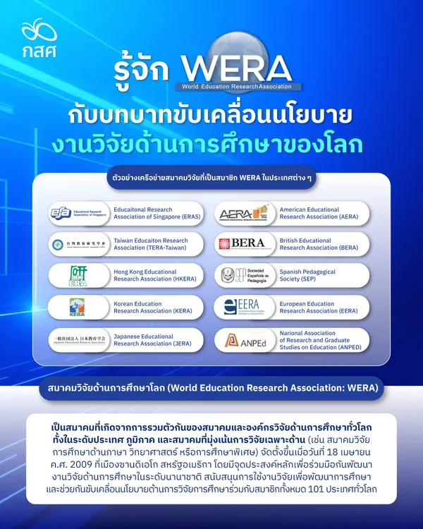 ทั้งนี้ WERA เป็นเครือข่ายของสมาคมการวิจัยด้านการศึกษาระดับชาติ ระดับภูมิภาค และระดับนานาชาติ มีพันธกิจในการส่งเสริมความร่วมมือและยกระดับมาตรฐานการวิจัยทางการศึกษาในระดับนานาชาติ ตลอดจนสนับสนุนการขับเคลื่อนการพัฒนานโยบายและการปฏิบัติที่เกี่ยวกับการวิจัยด้านการศึกษาทั่วโลก โดยปัจจุบันมีภาคีสมาชิกสมาคมการวิจัยด้านการศึกษาระดับชาติจากทั่วโลกมากกว่า 30 สมาคม ซึ่งหลายองค์กรมีประวัติการจัดตั้งและการดำเนินงานสนับสนุนการวิจัยด้านการศึกษามายาวนานมากกว่า 50-100 ปี เช่น American Education Research Association (AERA), European Education Research Association (EERA) หรือ Japanese Education Research Association (JERA) เป็นต้น โดยผู้บริหารของ WERA and AERA ได้เตรียมสนับสนุนการจัดตั้ง THERA ขึ้นในอนาคต และจะส่งผู้แทนสหพันธ์มาร่วมทำงานกับเครือข่ายการวิจัยด้านการศึกษาของประเทศไทยในช่วงวันที่ 7-8 สิงหาคม 2568 นี้ ในการประชุมวิชาการด้านการศึกษาระดับนานาชาติ (ThaiCER 2025) ซึ่ง สกศ. และ กสศ. ร่วมกับภาคีหน่วยงานวิจัยด้านการศึกษาจะร่วมกันเป็นเจ้าภาพจัดขึ้นที่โรงแรมอัศวินแกรนด์คอนเวนชั่น https://thaicer2025.onec.go.th/