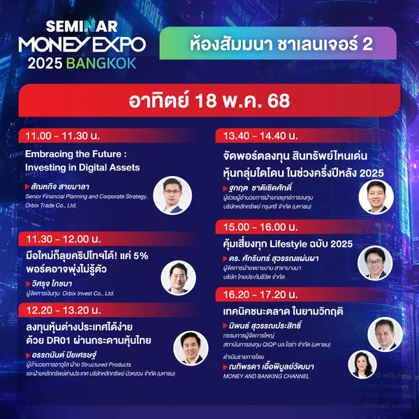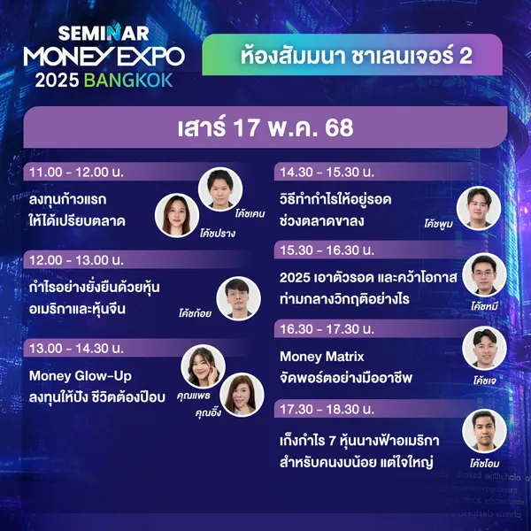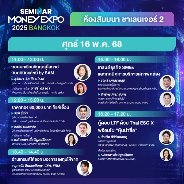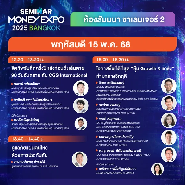เข้าร่วมสัมมนาฟรี ไม่มีค่าใช้จ่าย ตลอดวันที่ 15-18 พฤษภาคม 2568 ณ อาคารชาเลนเจอร์ 2-3 อิมแพ็ค เมืองทองธานี ติดตามข้อมูลได้ทาง Facebook: Money Expo และเว็บไซต์ www.moneyexpo.net