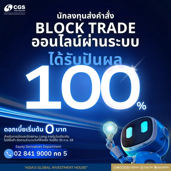 CGSI คืนกำไรให้นักลงทุนที่ลงทุน Block Trade ผ่านระบบ BETS รับปันผล 100% พร้อมสิทธิพิเศษดอกเบี้ย 0 บาท