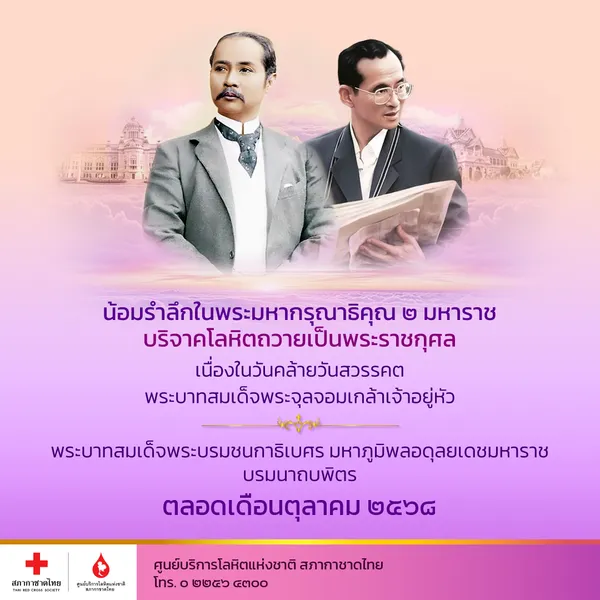 ศูนย์บริการโลหิตแห่งชาติ สภากาชาดไทย เชิญชวนพสกนิกรชาวไทย ร่วมน้อมรำลึกในพระมหากรุณาธิคุณ 2 มหาราช บริจาคโลหิตถวายเป็นพระราชกุศล เนื่องในวันคล้ายวันสวรรคต พระบาทสมเด็จพระจุลจอมเกล้าเจ้าอยู่หัว รัชกาลที่ 5 วันที่ 23 ตุลาคม และพระบาทสมเด็จพระบรมชนกาธิเบศร มหาภูมิพลอดุลยเดชมหาราช บรมนาถบพิตร วันที่ 13 ตุลาคม ตลอดเดือนตุลาคม 2568 ณ ศูนย์บริการโลหิตแห่งชาติ สภากาชาดไทย หน่วยรับบริจาคโลหิตประจำที่ 7 แห่ง (Fixed Station) และภาคบริการโลหิตแห่งชาติ 12 แห่งทั่วประเทศ