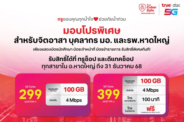 น้ำท่วมจากไป น้ำใจคงอยู่..... ทรู - ดีแทค พร้อมดูแลชาวหาดใหญ่–สงขลา ด้วยสมาร์ทโฟนราคาพิเศษเริ่มเพียง 99 บาท หรือ แพ็กเกจรายเดือนลด 50% รับสิทธิ์ได้ตั้งแต่วันนี้ถึงสิ้นปี 68