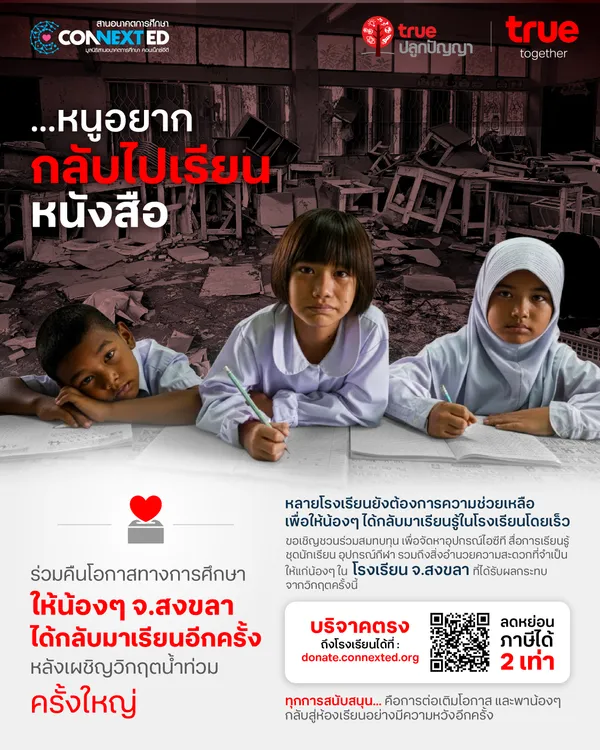 วันนี้ หลายโรงเรียนในจ.สงขลา ยังคงต้องการความช่วยเหลืออย่างเร่งด่วน...ร่วมส่งต่อพลังแห่ง “การให้” ได้ง่ายๆ เพียงปลายนิ้ว พร้อมรับสิทธิ์ลดหย่อนภาษี 2 เท่า โดยเงินบริจาคจะถูกส่งตรงถึงโรงเรียนคอนเน็กซ์อีดีภายใต้การดูแลของทรู ในจ.สงขลาที่ได้รับผลกระทบ อย่างโปร่งใส ตรวจสอบได้ ตั้งแต่วันนี้ ถึง 31 ธันวาคม 2568 ผ่านระบบระดมทุนเพื่อการศึกษา (CONNEXT ED Crowdfunding) ได้ที่ https://donate.connexted.org/?openExternalBrowser=1