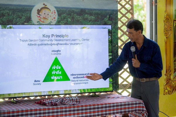 นายกฤตยรัฐ ปารมี ผู้ช่วยเลขาธิการมูลนิธิเจริญโภคภัณฑ์พัฒนาชีวิตชนบท เผยว่า “เครือเจริญโภคภัณฑ์ ยึดมั่นในค่านิยม '3 ประโยชน์' คือการสร้างประโยชน์ต่อประเทศชาติ ประชาชน และสุดท้ายจึงเป็นองค์กร โดยมูลนิธิฯ ได้น้อมนำพระปฐมบรมราชโองการในพระบาทสมเด็จพระเจ้าอยู่หัว รัชกาลที่ 10 “เราจะสืบสาน รักษา และต่อยอด และครองแผ่นดินโดยธรรม เพื่อประโยชน์สุขแห่งอาณาราษฎรตลอดไป” พร้อมกับใช้หลักปรัชญา “เศรษฐกิจพอเพียง” มาเป็นเครื่องมือในการพัฒนาชุมชนและสร้างอาชีพอย่างยั่งยืน ภายใต้โครงการซีพี พัฒนาอาชีพ ตามดําริ พลเอกเปรม ติณสูลานนท์ การเยี่ยมชมครั้งนี้มีวัตถุประสงค์เพื่อแลกเปลี่ยนการเรียนรู้ โดยคณะดูงานได้เยี่ยมชม “สวนเทพหยา”