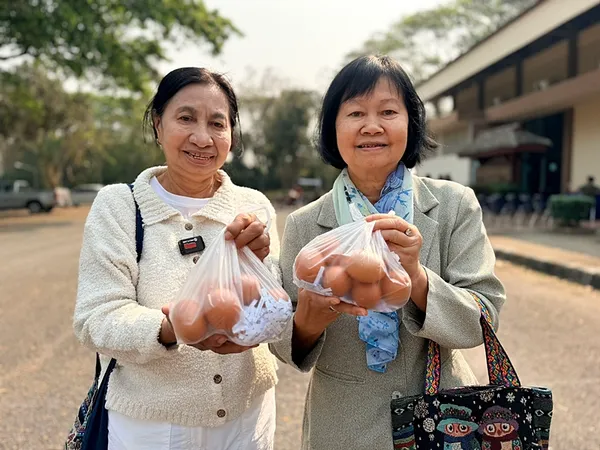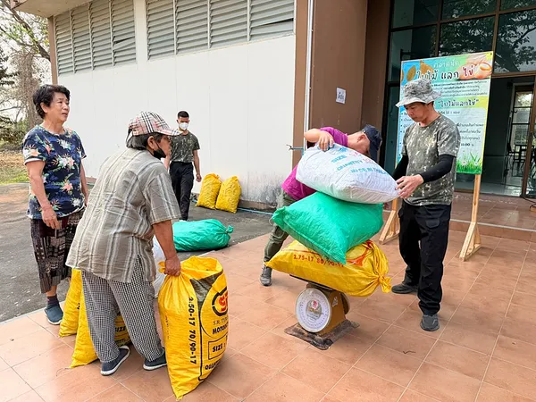 ใบไม้แห้งถูกชั่งน้ำหนักทีละกระสอบ ก่อนแลกเป็นไข่ไก่ ชาวบ้านบางคนถือถุงไข่กลับบ้านพร้อมรอยยิ้ม บางคนแวะคุยกันเหมือนตลาดนัดของชุมชน บรรยากาศเรียบง่าย แต่สะท้อนการมีส่วนร่วมของชุมชนที่ช่วยกันลดการเผาเศษวัสดุทางการเกษตร หนึ่งในต้นเหตุของ PM 2.5 ในภาคเหนือช่วงฤดูแล้ง