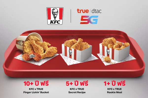 - ลูกค้าที่ใช้งานนานกว่า 5 ปี: รับฟรี ชุด KFC X TRUE Secret Recipe มูลค่า 135 บาท (ไก่ทอด 3 ชิ้น) เติมเต็มรอยยิ้มให้กันและกัน