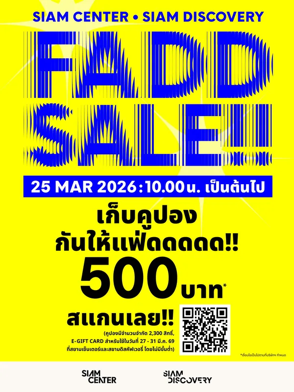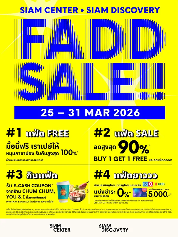 สยามเซ็นเตอร์ เมืองแห่งไอเดียที่ล้ำเทรนด์ และ สยามดิสคัฟเวอรี่ ดิ เอ็กซ์พลอราทอเรี่ยม ปลุกอารมณ์ เอาใจขาช็อปปิ้งใจกลางเมือง กับแคมเปญสุดร้อนแรง “FADD SALE ช็อปให้แฟ่ดดดดด!” ที่สายช็อปไม่ควรพลาด รวมทุกดีลฮอตแห่งปีไว้ในที่เดียว มอบประสบการณ์ช็อปปิ้งที่ผสานความคุ้มค่าพร้อมรับความสนุก โปรแรง ช็อปคุ้ม กับดีลพิเศษจากร้านค้าชั้นนำมากมาย ให้ทุกโมเมนต์กลายเป็น “ช็อปให้แฟ่ด” ตั้งแต่วันที่ 25 – 31 มีนาคม 2569 ที่ สยามเซ็นเตอร์ และ สยามดิสคัฟเวอรี่