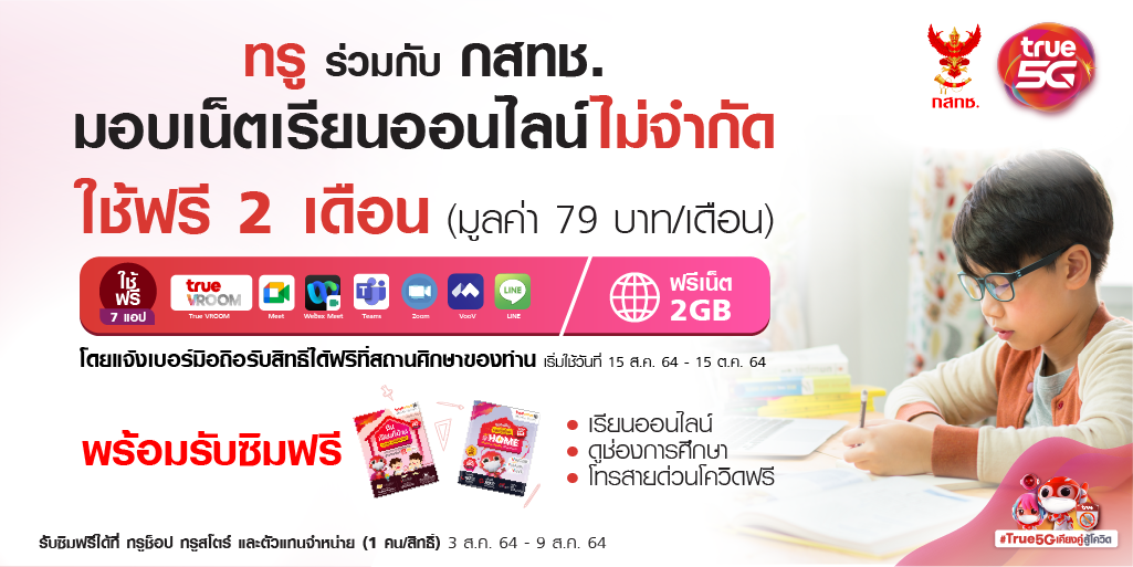 โดยมอบแพ็กเกจเน็ตเรียนออนไลน์ ไม่อั้น ความเร็ว 10 เมกะบิต (มูลค่าเดือนละ 79 บาท) นาน 2 เดือน ฟรี ใช้แอปพลิเคชัน เรียนออนไลน์ อาทิ True Vroom, Microsoft Team, Google Meet, Zoom, Google Meet, Cisco Meeting, WebEx, Line Chat พร้อมใช้งานอินเตอร์เน็ต ความเร็วเต็มสปีด อีก 2 กิกะไบต์