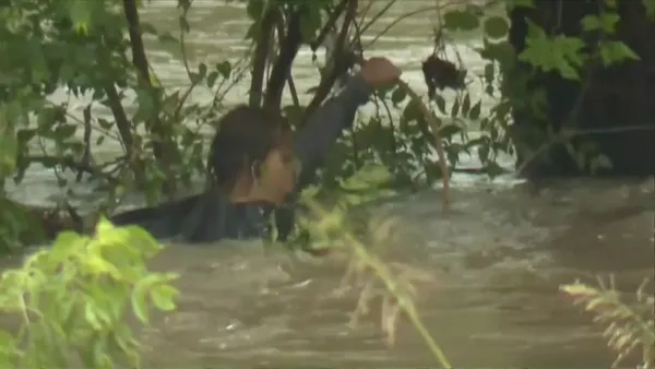 เจ้าหน้าที่ภัยเข้าช่วยเหลือหญิงคนหนึ่ง ที่เกาะอยู่บนต้นไม้ท่ามกลางน้ำท่วมและกระแสน้ำไหลเชี่ยวกราก ในเมืองแคนซัส ซิตี้ รัฐมิสซูรี หลังเกิดเหตุน้ำท่วมฉับพลันเมื่อวานนี้