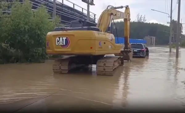ส่วนที่จังหวัดระยอง เจ้าหน้าที่กู้ภัยนำรถแบคโฮลุยฝ่ากระแสน้ำ เข้าไปลากรถยนต์ที่จมน้ำท่วมอยู่กลางถนน ท่ามกลางฝนตกหนัก