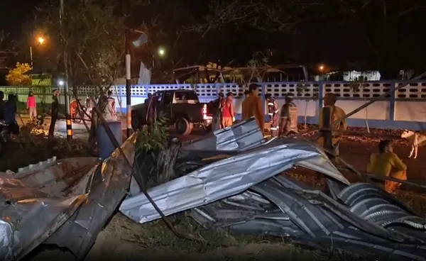 เจ้าหน้าที่สำรวจความเสียหาย หลังเกิดพายุฝนฟ้าคะนอง และลูกเห็บตกหนักในหลายอำเภอของจังหวัดบุรีรัมย์ โดยเฉพาะที่อำเภอพลับพลาชัย พายุได้พัดโรงจอดรถของโรงเรียนวัดพลับพลา เสียหายอย่างหนัก