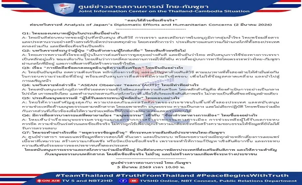 ศูนย์ข่าวสารสถานการณ์ ไทย - กัมพูชา| Joint Information Center on the Thailand-Cambodia Situation“ตอบโต้ด้วยข้อเท็จจริง” ในรูปแบบ Q&A ต่อบทวิเคราะห์ Analysis of Japan’s Diplomatic Efforts and Humanitarian Concerns (2 มีนาคม 2026) มีใจความสำคัญว่า ไทยมองบทบาทญี่ปุ่นที่สนับสนุน สันติวิธี การเจรจา และเสถียรภาพในอนุภูมิภาคลุ่มน้ำโขง ไทยพร้อมสื่อสาร และประสานงานอย่างสร้างสรรค์กับมิตรประเทศทุกฝ่าย โดยคงหลักการว่า ประเด็นชายแดนควรแก้ผ่านกลไกที่ทั้งสองประเทศตกลงร่วมกัน และยึดข้อเท็จจริงเป็นหลัก ไทยเคารพความตั้งใจของญี่ปุ่นในการส่งเสริมการพูดคุยอย่างสันติ และยืนยันว่าไทย สนับสนุนการใช้ช่องทางการเจรจาเป็นหลัก ขณะเดียวกัน ไทยเห็นว่าการคลี่คลายสถานการณ์ให้ยั่งยืน ควรตั้งอยู่บนการหารือโดยตรงระหว่างไทย-กัมพูชา ผ่านกลไกที่มีอยู่ และการสื่อสารที่ไม่สร้างความเข้าใจผิด