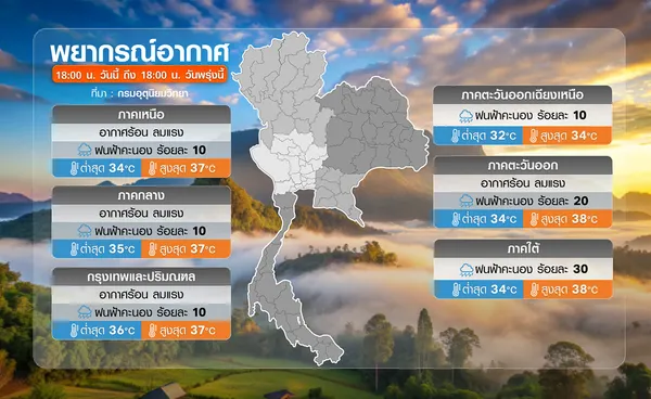 พยากรณ์อากาศตั้งแต่เวลา 18:00 น. วันนี้ ถึง 18:00 น. วันพรุ่งนี้