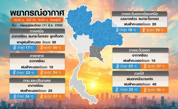 ขณะที่ กรมอุตุนิยมวิทยา ออกประกาศ เรื่อง พายุฤดูร้อนบริเวณประเทศไทยตอนบน ฉบับที่ 3 ซึ่งจะมีผลกระทบจนถึงวันที่ 13 มีนาคม 2569 / บริเวณประเทศไทยตอนบนจะมีพายุฤดูร้อนเกิดขึ้น โดยเริ่มจากภาคเหนือก่อน ส่วนภาคกลาง ด้านตะวันตกของภาคตะวันออกเฉียงเหนือ และภาคตะวันออก รวมทั้งกรุงเทพมหานครและปริมณฑล จะได้รับผลกระทบในระยะต่อไป โดยจะมีลักษณะของพายุฝนฟ้าคะนอง ลมกระโชกแรง ลูกเห็บตก และฝนตกหนักบางแห่ง รวมถึงฟ้าผ่าที่อาจเกิดขึ้นได้บางพื้นที่ เนื่องจากคลื่นกระแสลมฝ่ายตะวันตกจากประเทศเมียนมาเคลื่อนเข้าปกคลุมภาคเหนือ ประกอบกับจะมีบริเวณความกดอากาศสูงหรือมวลอากาศเย็นกำลังปานกลางอีกระลอกหนึ่งจากประเทศจีนเคลื่อนเข้าปกคลุมภาคตะวันออกเฉียงเหนือ ภาคตะวันออก และทะเลจีนใต้ ในขณะที่ประเทศไทยตอนบนมีอากาศร้อน