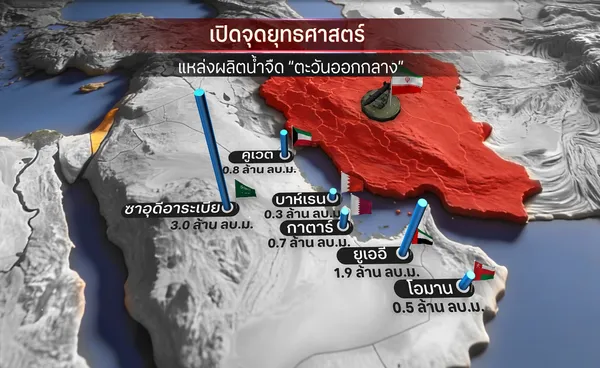 สำหรับแหล่งผลิตน้ำจืดจากน้ำทะเล ถือว่าเป็นจุดยุทธศาสตร์และมีความสำคัญของชาติตะวันออกกลาง หากมีการโจมตีโรงงานกลั่นน้ำทะเลเป็นน้ำจืด จะนับว่าเป็นการทำลายโครงสร้างพื้นฐานที่สำคัญกระทบเป็นวงกว้างในภูมิภาคตะวันออกกลางซึ่งพื้นที่ส่วนใหญ่เป็นทะเลทรายแห้งแล้ง ทำให้ต้องพึ่งพาการพัฒนาเทคโนโลยีการผลิตน้ำจืด ขึ้นมาเอง แหล่งผลิตน้ำดื่มหลักของภูมิภาคนี้มาจาก น้ำทะเล เป็นหลัก โดยพบว่า ภูมิภาคตะวันออกกลางครองสัดส่วนกำลังการผลิตน้ำจืดจากน้ำทะเลสูงถึงประมาณร้อยละ 45-50 โดยซาอุดีอาระเบีย มีกำลังการผลิตสูงถึงร้อยละ 70 มากสุดในโลกประมาณ 3 ล้านลูกบาศกเมตรต่อวัน ส่วนยูเออี มีกำลังการผลิต ร้อยละ 42 กำลังการผลิตอยู่ที่ 1.9 ล้านลูกบาศก์เมตรต่อวัน ขณะที่พบว่า กาตาร์เป็นประเทศ ที่พึ่งพาน้ำจืดที่กลั่นจากน้ำทะเลเกือบ 100 เปอร์เซนต์ สำหรับน้ำดื่มในครัวเรือน นับเป็นสัดส่วนมากที่สุดแห่งหนึ่งของโลก ส่วนคูเวตกว่าร้อยละ 90 พึ่งพาการผลิตน้ำจืดจากน้ำทะเลในการอุปโภคบริโภค เช่นเดียวกับ โอมาน แต่พบว่ากำลังการผลิตยังน้อย ขณะที่ในส่วนของอิสราเอล มีกำลังการผลิตน้ำจืด จากโรงผลิตหลัก 5 แหล่ง ซึ่งหากแหล่งผลิตน้ำจืดซึ่งเป็นแหล่งยุทธศาสตร์สำคัญถูกโจมตี ก็จะส่งผลให้น้ำดื่มขาดแคลนทันทีภายในไม่กี่วัน