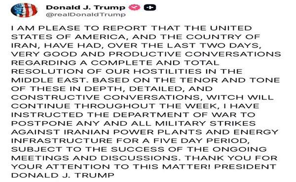 ด้านโดนัลด์ ทรัมป์ ประธานาธิบดีสหรัฐอเมริกา หลังจาได้โพสต์ผ่าน Truth Social เมื่อ 22 มีนาคมเวลา 6.44 น.ตามเวลาท้องถิ่น เรียกร้องให้ อิหร่านเปิดช่องแคบฮอร์มุซอย่างเต็มรูปแบบภายใน 48 ชั่วโมง หากไม่ดำเนินการสหรัฐฯ จะโจมตีและทำลายโรงไฟฟ้าต่างๆ ของอิหร่าน โดยเริ่มจากโรงไฟฟ้าที่ใหญ่ที่สุดก่อน โดยจะถึงเส้นจายช่วงเช้าวันที่ 24 มีนาคม เวลา 6.44 น. ตามเวลาในไทย ล่าสุดวันนี้(23 มี.ค.) ประธานาธิบดีสหรัฐฯ ได้โพสต์ ผ่าน Truth Social ระบุว่า อิหร่าน และสหรัฐฯ ได้เจรจาร่วมกันเพื่อหาทางยุติความขัดแย้งในตะวันออกกลาง ซึ่งมีแนวโน้มไปในทิศทางที่ดี ทำให้ได้สั่งการระงับการโจมตีทางทหารต่อโครงสร้างด้านพลังงานอิหร่านเป็นการชั่วคราว 5 วัน เพื่อเปิดทางให้เจ้าหน้าที่ได้หารือร่วมกันในรายละเอียดเชิงลึกและเปิดทางสู่การยุติความขัดแย้งต่อไปในอนาคต