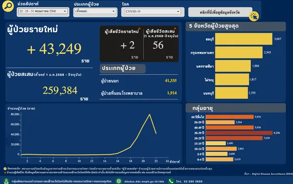 กรมควบคุมโรค กระทรวงสาธารณสุข รายงานสถานการณ์โรคโควิด-19 ประจำสัปดาห์ที่ 22 ของปี 2568 (ระหว่างวันที่ 25–31 พฤษภาคม 2568) ว่า ขณะนี้พบผู้ป่วยรายใหม่รวม 43,249 ราย แบ่งเป็นผู้ป่วยนอก 41,335 ราย และผู้ป่วยที่มีอาการรุนแรงเข้ารักษาในโรงพยาบาล 1,914 ราย ขณะที่ยอดสะสมผู้ติดเชื้อตั้งแต่ 1 มกราคม 68 ถึงปัจจุบันอยู่ที่ 259,384 ราย และพบผู้เสียชีวิตสะสม 56 ราย ตรวจสอบสถานการณ์โควิดล่าสุด คลิก