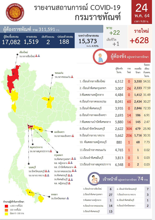 วันนี้( 24 พ.ค.64) นายวีระกิตติ์ หาญปริพรรณ์ รองอธิบดีกรมราชทัณฑ์ และโฆษกศูนย์บัญชาการแก้ไขปัญหาการแพร่ระบาดของโรคติดเชื้อไวรัสโคโรนา 2019 (โควิด-19) เปิดเผยว่า มีผู้ต้องขังติดเชื้อโควิด-19 รายใหม่จำนวน 628 ราย ยอดผู้ติดเชื้อสะสม 17,082 ราย รักษา หาย 22 รายแล้ว รวม 1,519 ราย เสียชีวิตเพิ่ม 1 ราย ยอดเสียชีวิตสะสม 2 ราย
