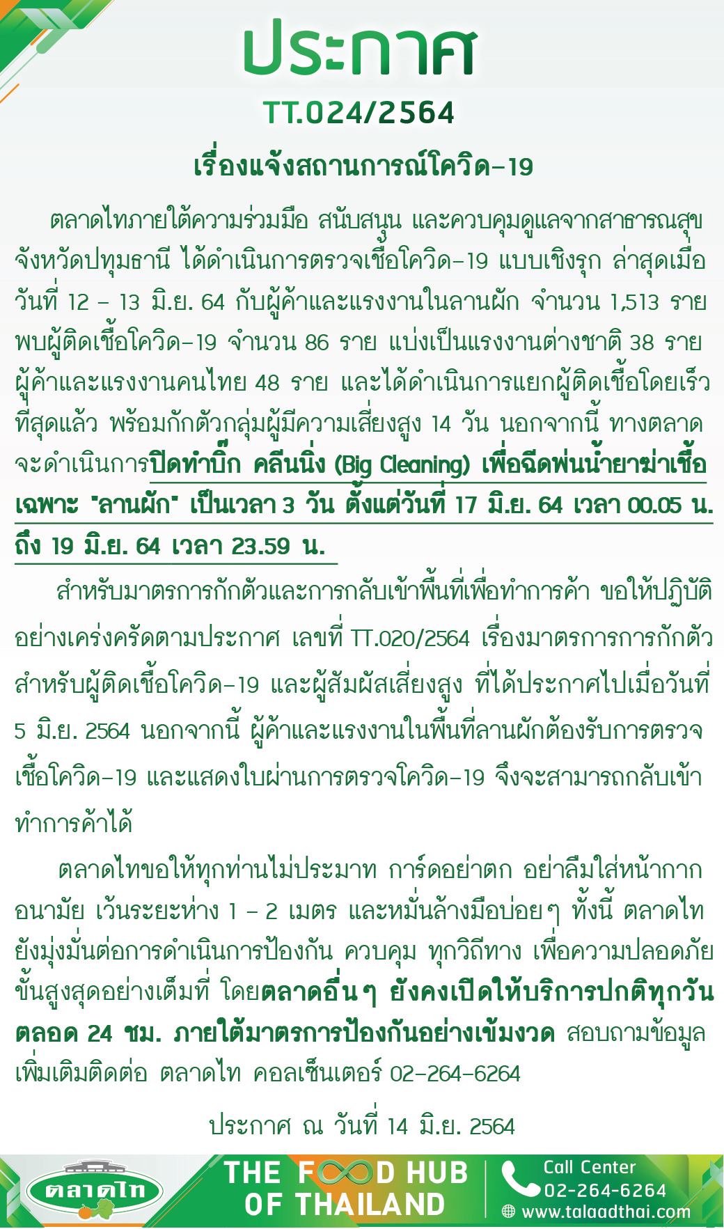 ตลาดไทแจ้งปิดบริการชั่วคราวพื้นที่ “ลานผัก” ตั้งแต่ 17-19 มิถุนายน 2564 เพื่อทำบิ๊กคลีนนิ่งและฉีดพ่นน้ำยาฆ่าเชื้อ ระบุว่า ตลาดไทภายใต้ความร่วมมือ สนับสนุน และควบคุมดูแลจากสาธารณสุขจังหวัดปทุมธานี ได้ดำเนินการตรวจเชื้อโควิด-19 แบบเชิงรุก ล่าสุดเมื่อวันที่ 12 - 13 มิ.ย. 64 กับผู้ค้าและแรงงานในลานผัก จำนวน 1,513 รายพบผู้ติดเชื้อโควิด-19 จำนวน 86 ราย แบ่งเป็นแรงงานต่างชาติ 38 ราย ผู้ค้าและแรงงานคนไทย 48 ราย และได้ดำเนินการแยกผู้ติดเชื้อโดยเร็วที่สุดแล้ว พร้อมกักตัวกลุ่มผู้มีความเสี่ยงสูง 14 วัน