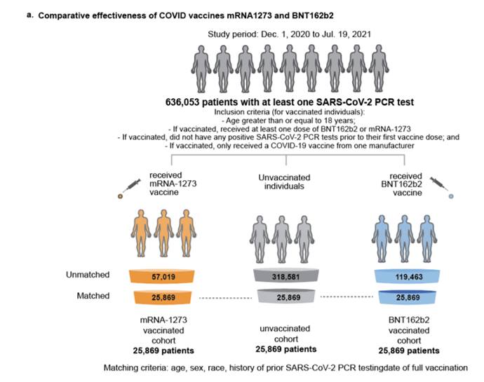 งานวิจัยชิ้นหนึ่ง ของทีมวิจัยในรัฐ Minnesota สหรัฐอเมริกา เก็บข้อมูลคนที่ได้รับวัคซีนไฟเซอร์ และ โมเดอร์นา เปรียบเทียบดูประสิทธิภาพของวัคซีนทั้งสองชนิด ในช่วงเวลาที่มีการระบาดของไวรัสโรคโควิด-19 ตั้งแต่เดือนธันวาคมปี 2563 จนถึงเดือนกรกฎาคมปี 2564ซึ่งเป็นช่วงที่มีการระบาดของไวรัสอัลฟา และ เดลตา ที่มีสัดส่วนที่แตกต่างกัน ในแต่ละช่วงที่เก็บข้อมูล กลุ่มตัวอย่างที่เก็บข้อมูลอยู่ที่ 25,896 คน ในแต่ละกลุ่มรวมทั้งกลุ่มที่ไม่ได้รับวัคซีนด้วย