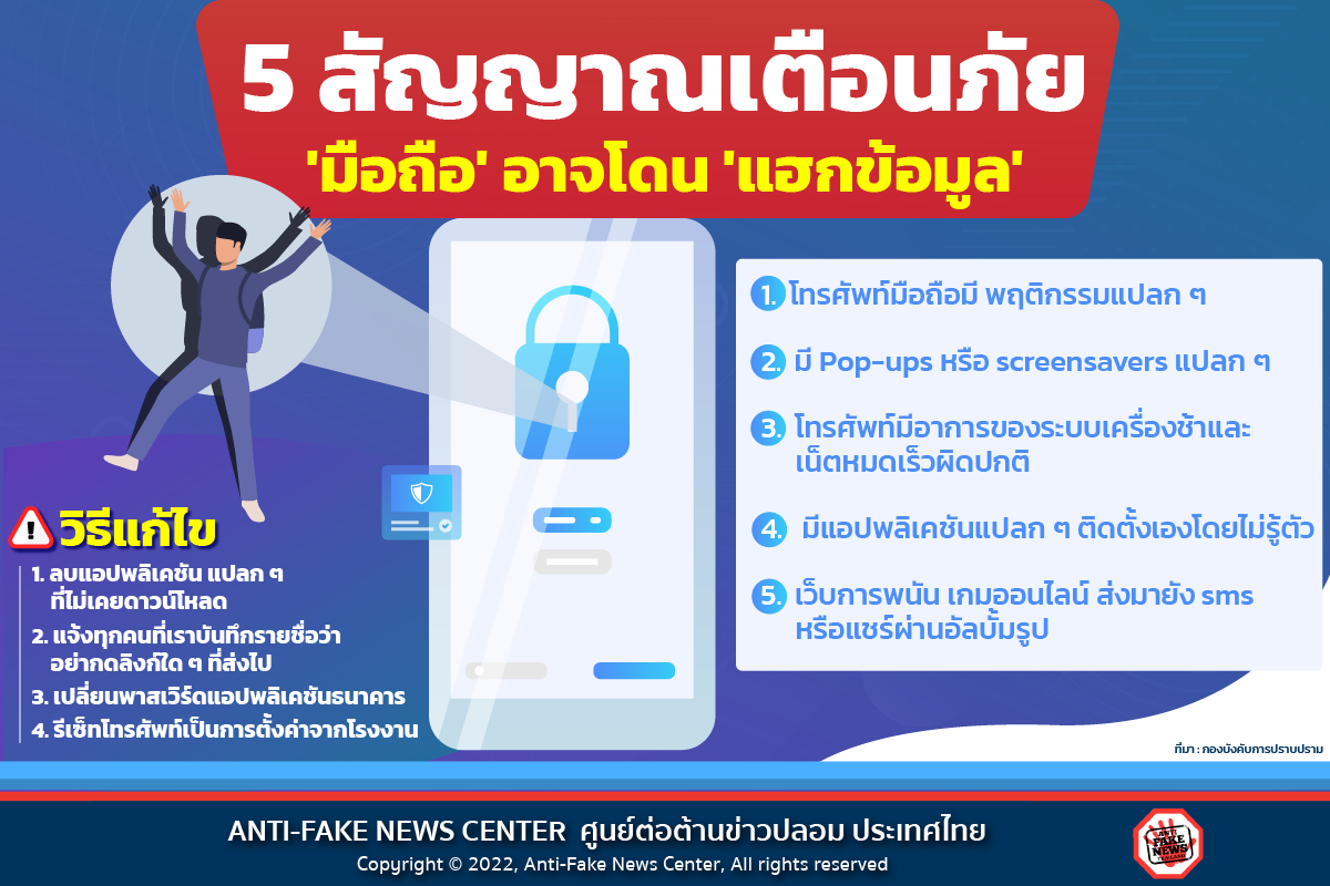 กองบังคับการปราบปราม ได้เผยแพร่ข้อมูลเกี่ยวกับการถูกมิจฉาชีพแฮกข้อมูลในมือถือ ได้ออกข้อแนะนำให้ประชาชนหมั่นสังเกตสมาร์ทโฟน หรือ มือถือหากมีอาการดังต่อไปนี้ อาจกำลังถูกโจรกรรมข้อมูลส่วนบุคคลอยู่ก็เป็นได้