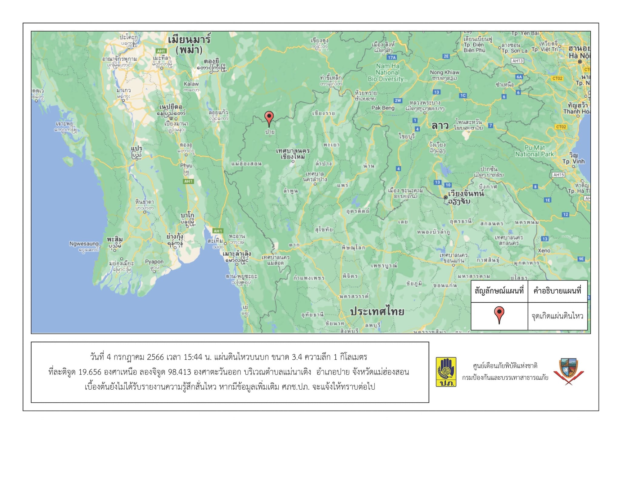 กรมป้องกันและบรรเทาสาธารณภัย รายงานเมื่อเวลา 15.44 น. 4 กรกฎาคม 2566 เกิดแผ่นดินไหวบนบก ขนาด 3.4 ความลึก 1 กิโลเมตร บริเวณตำบลแม่นาเติง อำเภอปาย จังหวัดแม่ฮ่องสอน เบื้องต้นยังไม่ได้รับรายงานความรู้สึกสั่นไหว