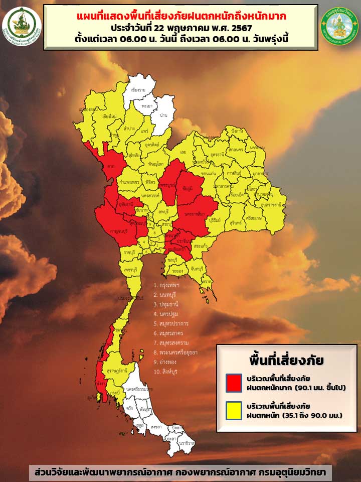 - พื้นที่เสี่ยงภัยฝนตกหนัก ระดับ (สีเหลือง) ได้แก่ แม่ฮ่องสอน เชียงใหม่ ลำพูน ลำปาง แพร่ อุตรดิตถ์ สุโขทัย พิษณุโลก กำแพงเพชร พิจิตร นครสวรรค์ ชัยนาท ลพบุรี สระบุรี สระแก้ว ชลบุรี ระยอง จันทบุรี ตราด ราชบุรี เพชรบุรี ประจวบฯ ชุมพร สุราษฎ์ธานี กระบี่ ภูเก็ต เลย หนองบัวลำภู หนองคาย อุดรธานี สกสลนคร บึงกาฬ นครพนม ขอนแก่น กาฬสินธุ์ มุกดาหาร มหาสารคาม ยโสธร ร้อยเอ็ด อำนาจเจริญ อุบลราชธานี บุรีรัมย์ สุรินทร์ ศรีสะเกษ สระแก้ว กรุงเทพฯ นนทบุรี ปทุมธานี นครปฐม สมุทรปราการ สมุทรปราการ สมุทรสาคร สมุทรสงคราม อยุธยาา อ่างทอง สิงห์บุรี