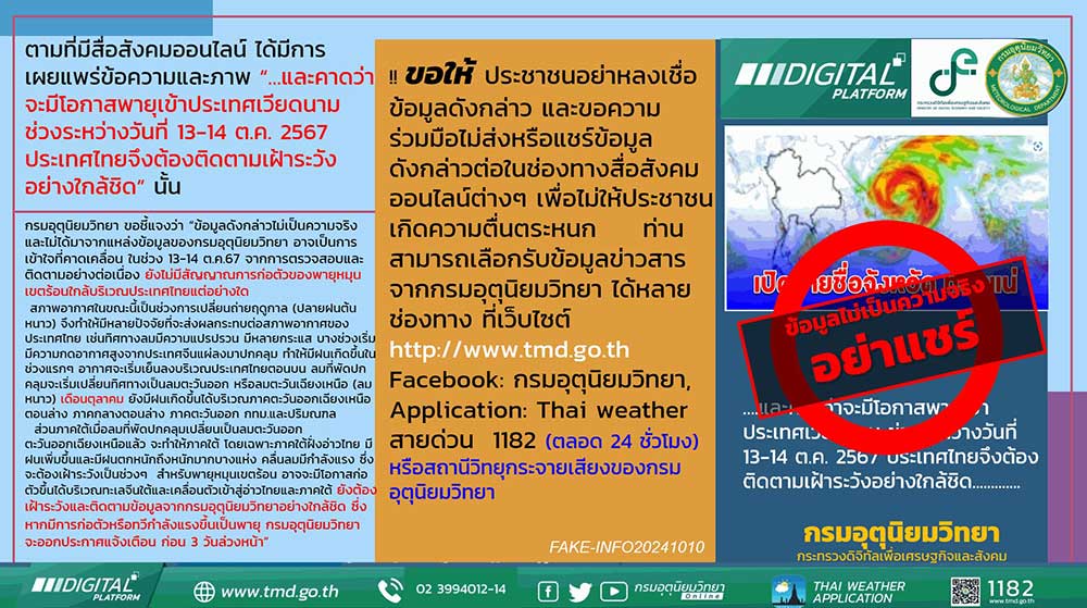 กรมอุตุนิยมวิทยา ขอชี้แจงว่า "ข้อมูลดังกล่าวไม่เป็นความจริง และไม่ได้มาจากแหล่งข้อมูลของกรมอุตุนิยมวิทยา อาจเป็นการเข้าใจที่คาดเคลื่อน ในช่วง 13-14 ต.ค.67 จากการตรวจสอบและติดตามอย่างต่อเนื่อง ยังไม่มีสัญญาณการก่อตัวของพายุหมุน