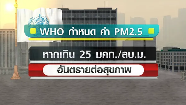 องค์กรอนามัยโลก (WHO) ตั้งค่าเฉลี่ยฝุ่นละออง PM 2.5 ในอากาศ ว่าหากมีเกินกว่า 25 ไมโครกรัมต่อลูกบาศก์เมตร ถือเป็นอันตรายต่อสุขภาพ ขณะที่ประเทศไทยกำหนดค่ามาตรฐานฝุ่น PM2.5 ค่าเฉลี่ย 24 ชั่วโมง จะต้องไม่เกิน 37.5 มคก./ลบ.ม.
