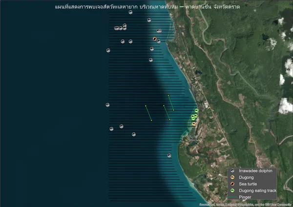 เพจเฟซบุ๊กของศูนย์วิจัยทรัพยากรทางทะเลและชายฝั่งอ่าวไทยฝั่งตะวันออก กรมทรัพยากรทางทะเลและชายฝั่ง โพสต์ภาพพร้อมระบุข้อความ หลังออกสำรวจประชากรสัตว์ทะเลหายากในถิ่นอาศัยของโลมาอิรวดีที่ดีที่สุดแห่งหนึ่งของไทย บริเวณทะเลตราด โดยใช้วิธีการบินสำรวจด้วยเครื่องบินเล็กไร้คนขับแบบปีกตรึง ขณะบินสำรวจพบ “พะยูน” เป็นครั้งแรกในรอบ 7 ปี ของบ้านไม้รูด ต.ไม้รูด อ.คลองใหญ่ นอกจากนี้ยังพบฝูงโลมาอิรวดี 20 ตัว จากการบิน 13 เที่ยวบิน ตลอดการสำรวจ ซึ่งมีโลมาคู่แม่ลูก จำนวน 6 คู่ ที่หาอาหารอยู่ในบริเวณเดียวกันอีกด้วย