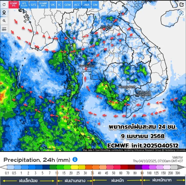 จากนั้นช่วง 8-11 เม.ย.68 ช่วงก่อนเทศกาลสงกรานต์ ฝนน้อยลงอากาศร้อนบริเวณประเทศไทยตอนบน ยังมีพายุฤดูร้อน (ฝนฟ้าคะนอง) บางแห่ง เนื่องจากยังมีหย่อมความกดอากาศต่ำปกคลุมบริเวณประเทศไทยตอนบนประกอบกับยังมีลมตะวันตก ตะวันตกเฉียงเหนือพัดปกคลุมทางภาคเหนือ ภาคกลางทางด้านตะวันตก และมีลมใต้ ลมตะวันออกเฉียงใต้ พัดสอบเข้าหากันบริเวณภาคอีสาน ภาคกลาง