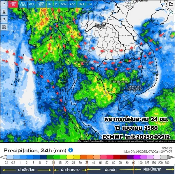 ส่วนในช่วงวันที่ 14 – 15 เมย. ลมตะวันออกและลมตะวันออกเฉียงใต้ที่พัดปกคลุมอ่าวไทย และภาคใต้จะมีกำลังแรงขึ้น ทำให้ภาคใต้ฝั่งตะวันออกมีฝนเพิ่มขึ้นและมีคลื่นลมแรงขึ้น โดยอ่าวไทยตอนล่างมีคลื่นสูง 1 – 2 เมตร บริเวณที่มีฝนฟ้าคะนองคลื่นสูงมากกว่า 2 เมตร