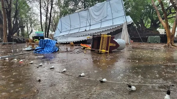 ภาพความเสียหาย และความรุนแรงของพายุฤดูร้อนที่พัดถล่มเต็นท์จุดบริการประชาชนช่วงเทศกาลสงกรานต์ ของฝ่ายปกครองตำบลกระชอน อำเภอพิมาย จังหวัดนครราชสีมา ขณะที่กระแสลมกระโชกแรง พัดข้าวของปลิวกระจัดกระจาย เจ้าหน้าที่ต้องรีบขนย้ายข้าวของหลบฝน กลายเป็นผู้ประสบภัยเสียเอง