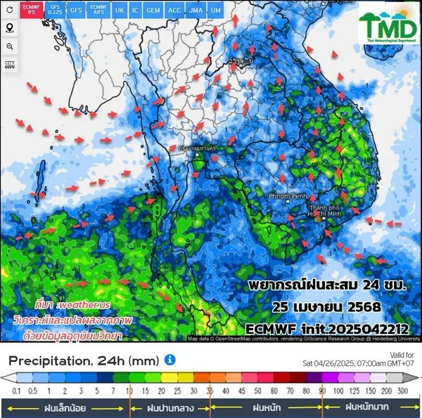 ในช่วงวันที่ 24– 25 เม.ย. ประเทศไทยตอนบนมีอากาศร้อนถึงร้อนจัด กับมีฝนน้อย โดยยังคงมีฝนฟ้าคะนองกับมีลมกระโชกแรงเกิดขึ้นได้บางพื้นที่ เนื่องจากความกดอากาศต่ำจากความร้อนปกคลุมประเทศไทยตอนบน ในขณะที่ลมตะวันตกเฉียงใต้ปกคลุมประเทศไทย สำหรับภาคใต้จะมีฝนเพิ่มขึ้น และมีฝนตกหนักบางแห่งบริเวณภาคใต้ตอนล่าง เนื่องจากลมตะวันตกเฉียงใต้พัดปกคลุมบริเวณทะเลอันดามันและภาคใต้ ในขณะที่ลมตะวันออกเฉียงใต้พัดปกคลุมบริเวณอ่าวไทยและภาคใต้