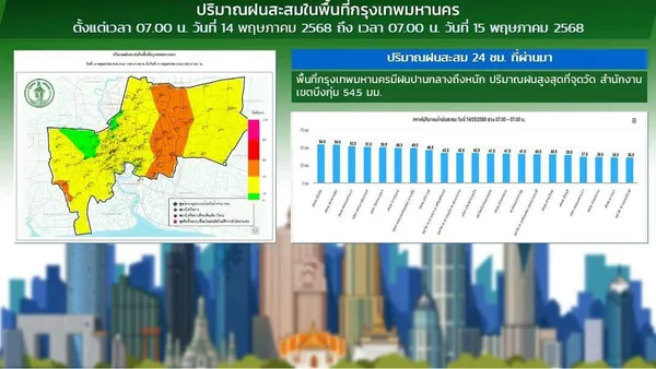 ปริมาณฝนสะสม 24 ชม.ในพื้นที่กรุงเทพมหานคร รายงานจากสำนักการระบายน้ำ ตั้งแต่เวลา 07.00 น.ของวันที่ 14 พ.ค. 68 ถึง เวลา 07.00 น. ของวันที่ 15 พ.ค. 68 มีรายงานฝนตกเล็กน้อยถึงปานกลาง และมีฝนตกหนักบางแห่ง ปริมาณฝนสูงที่สุดวัดได้ 54.5 มม. ที่จุดวัด สำนักงานเขตบึงกุ่ม