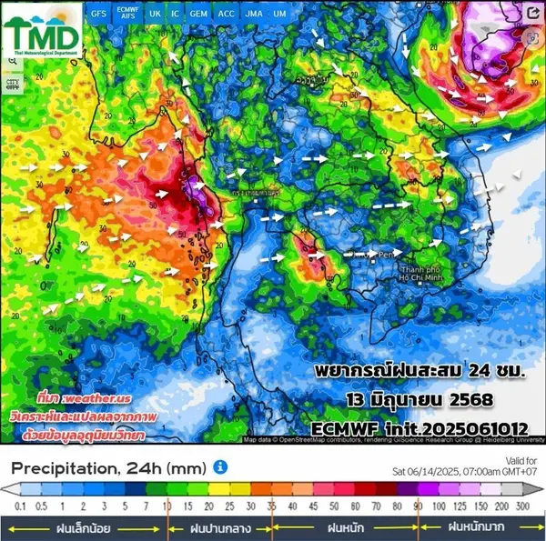 ในช่วงวันที่ 11 – 13 มิ.ย. พายุดีเปรสชันบริเวณทะเลจีนใต้ตอนบนมีแนวโน้มทวีกำลังแรงขึ้นเป็นพายุหมุนเขตร้อน โดยศูนย์กลางของพายุลูกนี้จะไม่เคลื่อนเข้าสู่ประเทศไทย แต่อาจทำให้มรสุมตะวันตกเฉียงใต้ที่พัดปกคลุมประเทศไทยมีกำลังแรงขึ้น ทำให้บริเวณด้านตะวันออกของภาคตะวันออกเฉียงเหนือมีฝนเพิ่มขึ้นและมีฝนตกหนักบางแห่ง และคลื่นลมในทะเลอันดามันและอ่าวไทยจะมีกำลังแรงขึ้น