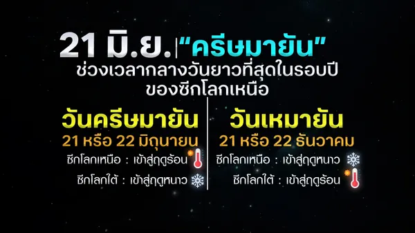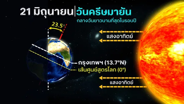 ในวันที่ 21 มิ.ย. 2568 ดวงอาทิตย์จะโคจรไปถึงจุดเหนือสุดบนท้องฟ้า ซึ่งเป็นผลจากการที่โลกเอียงทำมุมกับระนาบวงโคจรของตัวเอง โดยตั้งแต่ช่วงเดือนมีนาคม ดวงอาทิตย์จะเคลื่อนที่ไปทางทิศเหนือเรื่อย ๆ จนถึงจุดสูงสุดในวันที่ 21 มิถุนายน และหลังจากนั้นจึงจะเริ่มเคลื่อนกลับลงมาทางใต้ ผลจากการที่ดวงอาทิตย์อยู่ทางเหนือมากที่สุดในวันนี้ ทำให้เกิดปรากฏการณ์ที่ดวงอาทิตย์ขึ้นจากขอบฟ้าทางทิศตะวันออกเฉียงไปทางเหนือที่สุด และตกทางทิศตะวันตกเฉียงไปทางเหนือที่สุดเช่นกัน จึงทำให้มีช่วงเวลากลางวันยาวนานกว่ากลางคืนในวันดังกล่าว สำหรับประเทศไทยและประเทศอื่นๆ ในซีกโลกเหนือ