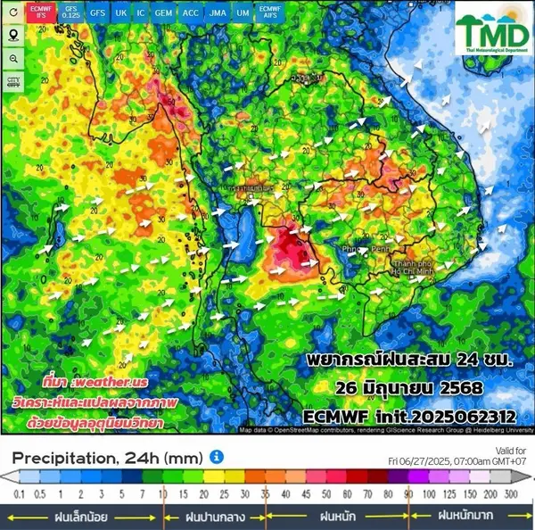 ในช่วงวันที่ 24 – 27 มิ.ย. ขอให้ประชาชนบริเวณประเทศไทยระวังอันตรายจากฝนตกหนักถึงหนักมากและฝนที่ตกสะสม ซึ่งอาจทำให้เกิดน้ำท่วมฉับพลันและน้ำป่าไหลหลาก โดยเฉพาะพื้นที่ลาดเชิงเขาใกล้ทางน้ำไหลผ่านและพื้นที่ลุ่ม และเกษตรกรควรเตรียมการป้องกันและระวังความเสียหายที่จะเกิดต่อผลผลิตทางการเกษตรไว้ด้วย