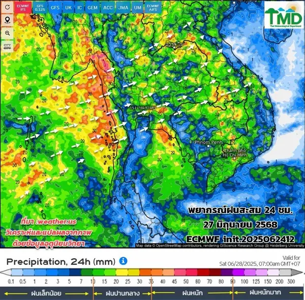 ในช่วงวันที่ 25 – 27 มิ.ย. ประเทศไทยมีฝนเพิ่มขึ้น และมีฝนตกหนักบางแห่ง โดยมีฝนตกหนักมากบางพื้นที่ในภาคเหนือ ภาคตะวันออกเฉียงเหนือตอนบน ภาคตะวันออก และภาคใต้ฝั่งตะวันตก เนื่องจากร่องมรสุมพาดผ่านภาคเหนือและภาคตะวันออกเฉียงเหนือ ประกอบกับมรสุมตะวันตกเฉียงใต้ที่พัดปกคลุมทะเลอันดามัน ประเทศไทย และอ่าวไทยมีกำลังปานกลาง