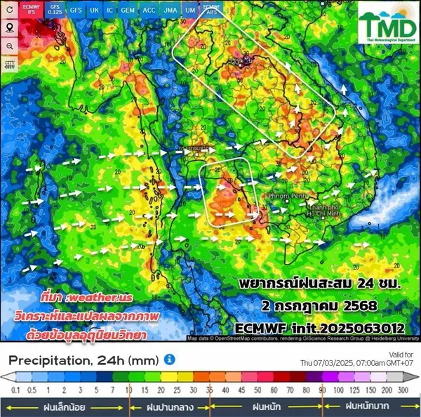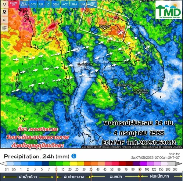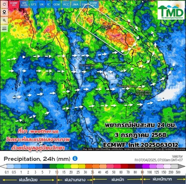 ในช่วงวันที่ 1– 6 ก.ค. ขอให้ประชาชนบริเวณประเทศไทย โดยเฉพาะบริเวณภาคเหนือ และภาคตะวันออกเฉียงเหนือ ระวังอันตรายจากฝนตกหนักถึงหนักมากและฝนที่ตกสะสม ซึ่งอาจทำให้เกิดน้ำท่วมฉับพลันและน้ำป่าไหลหลาก โดยเฉพาะพื้นที่ลาดเชิงเขาใกล้ทางน้ำไหลผ่านและพื้นที่ลุ่มไว้ด้วย