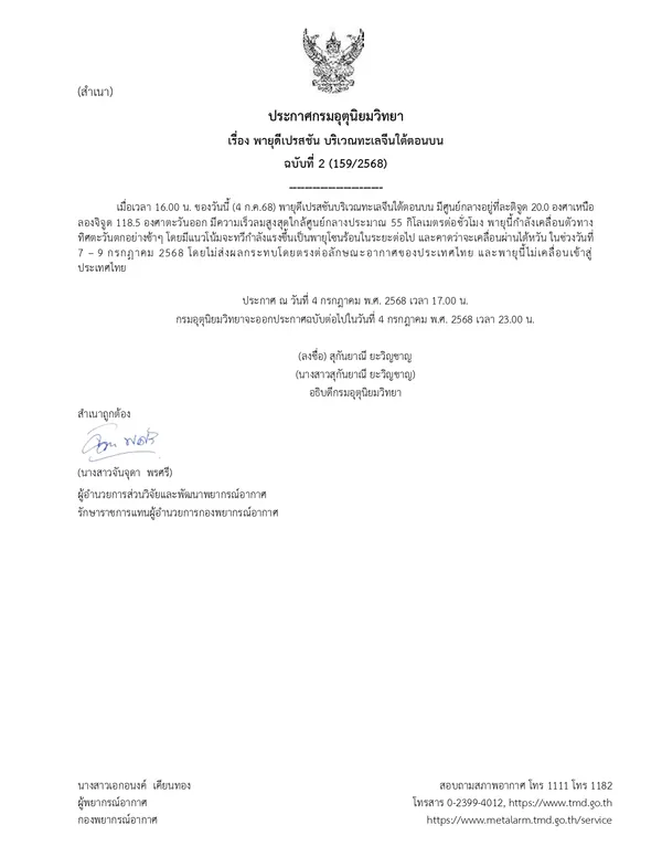 กรมอุตุนิยมวิทยาจะออกประกาศฉบับต่อไปในวันที่ 4 กรกฎาคม พ.ศ. 2568 เวลา 23.00 น.