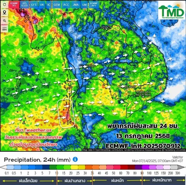 ในช่วงวันที่ 10 – 13 ก.ค. ภาคเหนือ ภาคตะวันออกเฉียงเหนือ ภาคตะวันออก และภาคใต้ มีฝนตกหนักถึงหนักมากบางแห่ง เนื่องจากจะมีร่องมรสุมพาดผ่านประเทศเมียนมาตอนบน ภาคเหนือตอนบน ภาคตะวันออกเฉียงเหนือตอนบน และประเทศเวียดนามตอนบน ประกอบกับหย่อมความกดอากาศต่ำที่ปกคลุมบริเวณเวียดนามตอนบนจะเคลื่อนตามแนวร่องมรสุมที่พาดผ่านในบริเวณดังกล่าว ในขณะที่มรสุมตะวันตกเฉียงใต้กำลังปานกลางยังคงพัดปกคลุมทะเลอันดามัน ประเทศไทย และอ่าวไทย ส่วนในช่วงวันที่ 14 - 15 ก.ค. ประเทศไทยยังคงมีฝนฟ้าคะนอง และมีฝนตกหนักบางแห่ง เนื่องจากร่องมรสุมจะเลื่อนขึ้นไปพาดผ่านประเทศเมียนมาตอนบนและประเทศลาวตอนบนเข้าสู่หย่อมความกดอากาศต่ำบริเวณประเทศเวียดนามตอนบน ประกอบกับมรสุมตะวันตกเฉียงใต้กำลังปานกลางพัดปกคลุมทะเลอันดามัน ประเทศไทย และอ่าวไทย