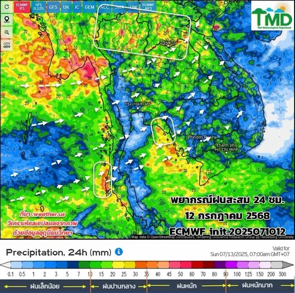 ในช่วงวันที่ 11 – 13 ก.ค. ภาคเหนือ ภาคตะวันออกเฉียงเหนือ ภาคตะวันออก และภาคใต้ มีฝนตกหนักถึงหนักมากบางแห่ง เนื่องจากจะมีร่องมรสุมพาดผ่านประเทศเมียนมาตอนบน ภาคเหนือตอนบน ภาคตะวันออกเฉียงเหนือตอนบน และประเทศเวียดนามตอนบน ประกอบกับหย่อมความกดอากาศต่ำที่ปกคลุมบริเวณเวียดนามตอนบนจะเคลื่อนตามแนวร่องมรสุมที่พาดผ่านในบริเวณดังกล่าว ในขณะที่มรสุมตะวันตกเฉียงใต้กำลังปานกลางยังคงพัดปกคลุมทะเลอันดามัน ประเทศไทย และอ่าวไทย