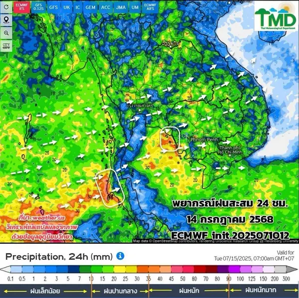ในช่วงวันที่ 11 – 13 ก.ค. ภาคเหนือ ภาคตะวันออกเฉียงเหนือ ภาคตะวันออก และภาคใต้ มีฝนตกหนักถึงหนักมากบางแห่ง เนื่องจากจะมีร่องมรสุมพาดผ่านประเทศเมียนมาตอนบน ภาคเหนือตอนบน ภาคตะวันออกเฉียงเหนือตอนบน และประเทศเวียดนามตอนบน ประกอบกับหย่อมความกดอากาศต่ำที่ปกคลุมบริเวณเวียดนามตอนบนจะเคลื่อนตามแนวร่องมรสุมที่พาดผ่านในบริเวณดังกล่าว ในขณะที่มรสุมตะวันตกเฉียงใต้กำลังปานกลางยังคงพัดปกคลุมทะเลอันดามัน ประเทศไทย และอ่าวไทย
