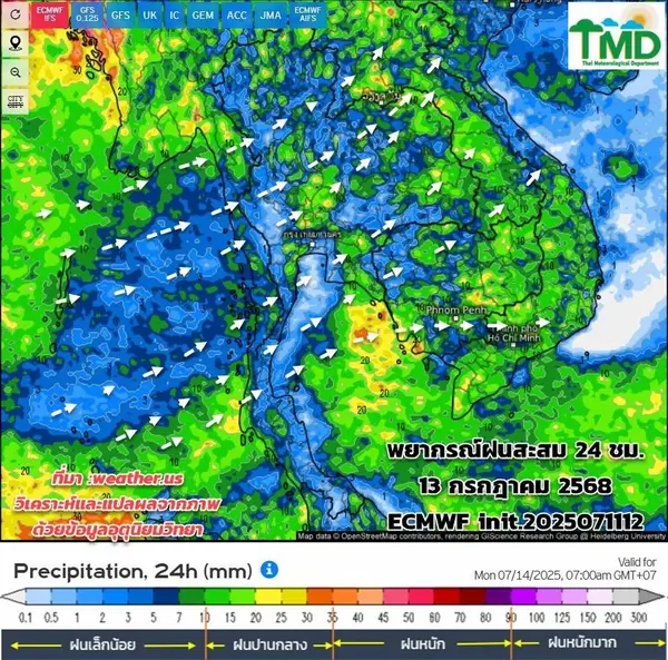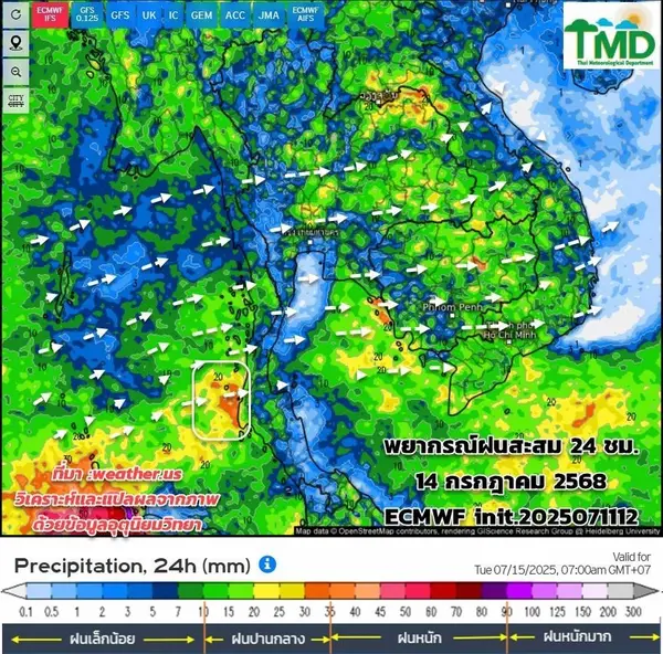 ส่วนในช่วงวันที่ 14-18 ก.ค. ประเทศไทยยังคงมีฝนฟ้าคะนอง และมีฝนตกหนักบางแห่ง เนื่องจากร่องมรสุมจะเลื่อนขึ้นไปพาดผ่านประเทศเมียนมาตอนบนและประเทศลาวตอนบนเข้าสู่หย่อมความกดอากาศต่ำบริเวณประเทศเวียดนามตอนบน ประกอบกับมรสุมตะวันตกเฉียงใต้กำลังปานกลางพัดปกคลุมทะเลอันดามัน ประเทศไทย และอ่าวไทย