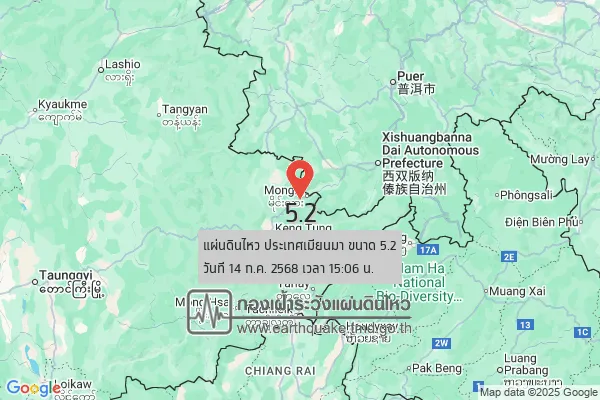 14 กรกฎาคม 2568 เวลา 15.06 น. กองเฝ้าระวังแผ่นดินไหว กรมอุตุนิยมวิทยา รายงานว่า เกิดเหตุแผ่นดินไหวในประเทศเมียนมา ขนาด 5.2 ความลึก 10 กิโลเมตร ทางทิศตะวันออกเฉียงเหนือของ อ.แม่สาย จ.เชียงราย ประมาณ 132 กม.