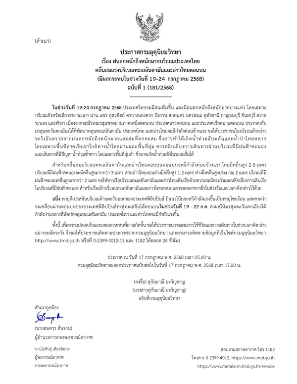 กรมอุตุนิยมวิทยา ประกาศเรื่อง ฝนตกหนักถึงหนักมากบริเวณประเทศไทย คลื่นลมแรงบริเวณทะเลอันดามันและอ่าวไทยตอนบน (มีผลกระทบในช่วงวันที่ 19-24 กรกฎาคม 2568) ฉบับที่ 1 (181/2568)
