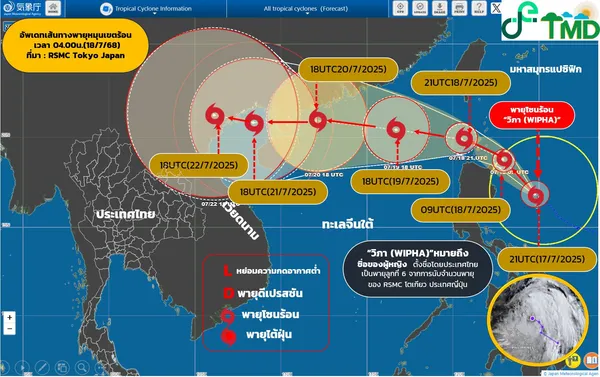 กรมอุตุนิยมวิทยา อัปเดตสถานการณ์และเส้นทางเดินพายุเช้าวันนี้ 18 กรกฎาคม 2568 เวลา 04.00น. วันนี้ พายุดีเปรสชันที่มีศูนย์กลางอยู่ทางตะวันออกของประเทศฟิลิปปินส์ได้ทวีกำลังแรงขึ้นเป็นพายุโซนร้อน "วิภา (WIPHA)" แล้ว กำลังเคลื่อนตัวทางตะวันตกเฉียงเหนือ คาดว่าจะเคลื่อนผ่านหัวเกาะลูซอลประเทศฟิลิปปินส์ และลงสู่ทะเลจีนใต้ตอนบนในเช้าของพรุ่งนี้ (19 กรกฎาคม 2568)